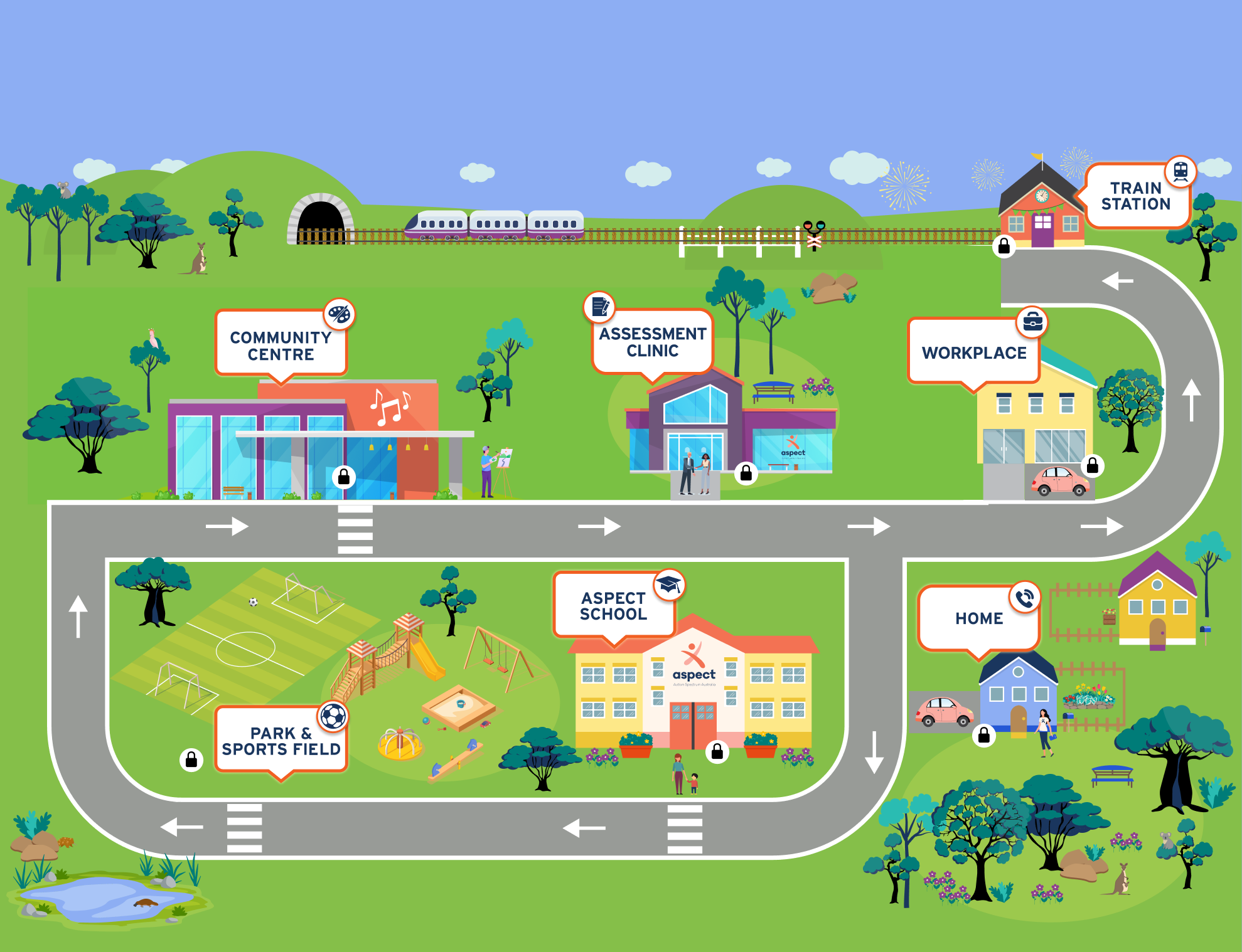 As you step through the fundraising tiers and reveal the stations on the Aspect Village Map, you'll discover a range of incredible services and vital support available to Australians on the autism spectrum.